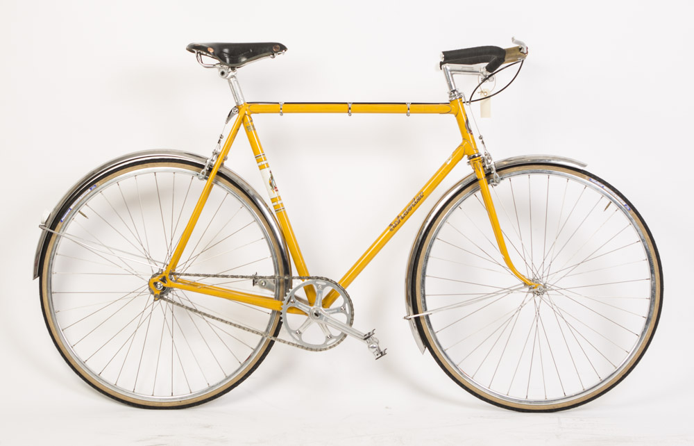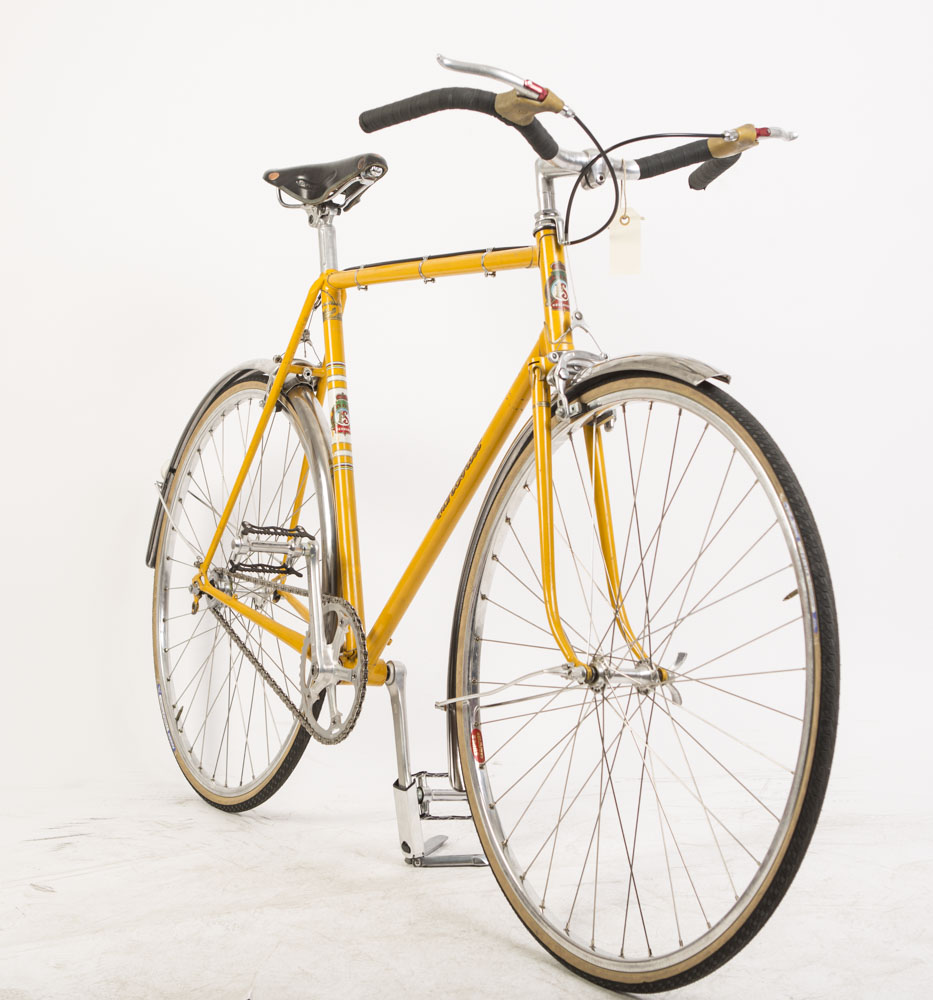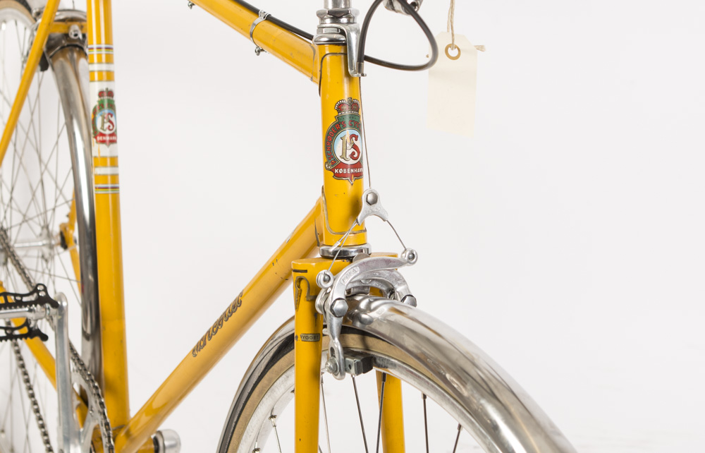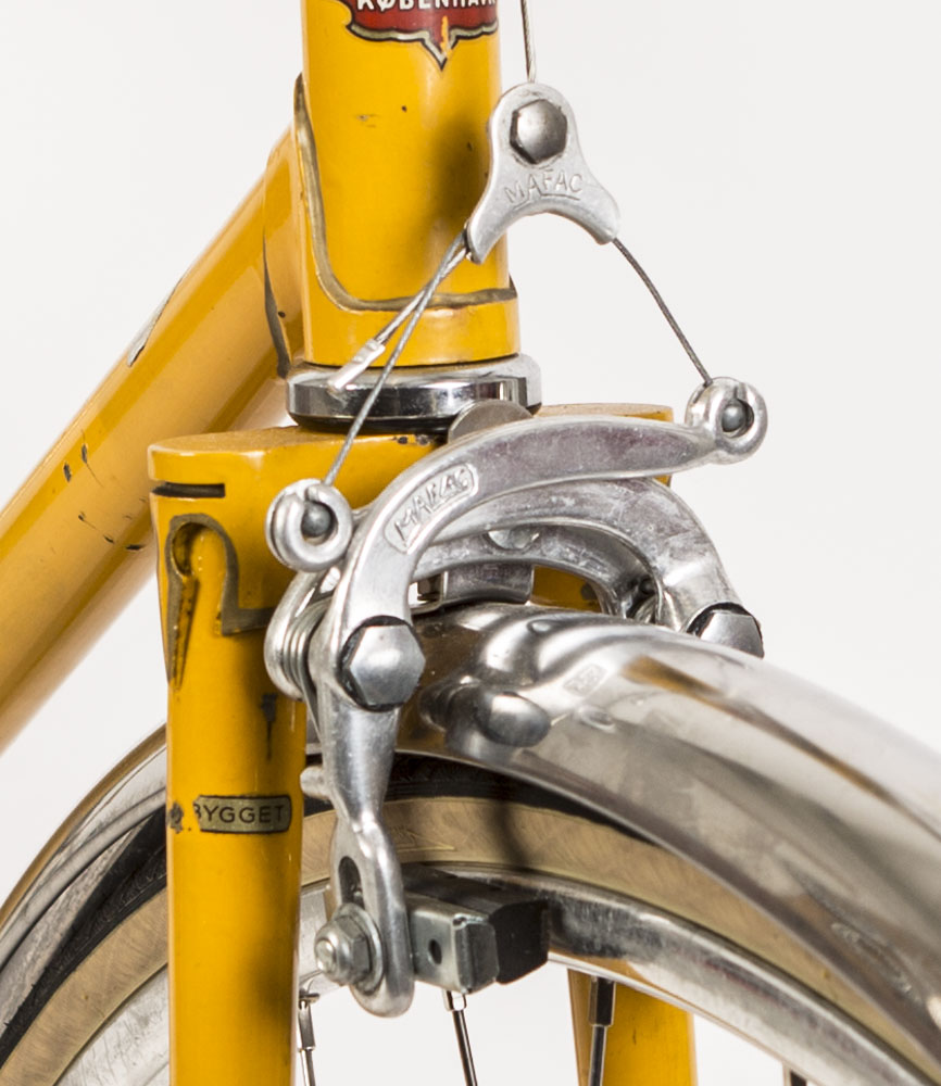 Yderst sjælden og smuk Schrøder fra 1970. Håndbygget hjul med smukke 27″ sølv poleret alu fælge , rustfrie eger og nav med vinge møtrikker. Mafac centertræk bremser.